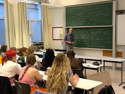 Er veranschaulichte uns ganz verschiedene Aspekte der Primzahlen, erklärte uns, dass die Lücken zwischen ihnen immer größer werden und niemand genau weiß, wie sie wirklich „verteilt” sind. Außerdem wurde deutlich, dass Mathe an der Uni manchmal ganz schön knifflig, aber auch richtig spannend ist! Das konnten wir an der Riemannschen Vermutung – einer noch ungelösten mathematischen Vermutung, die mit der Verteilung von Primzahlen zusammenhängt – hautnah erleben.