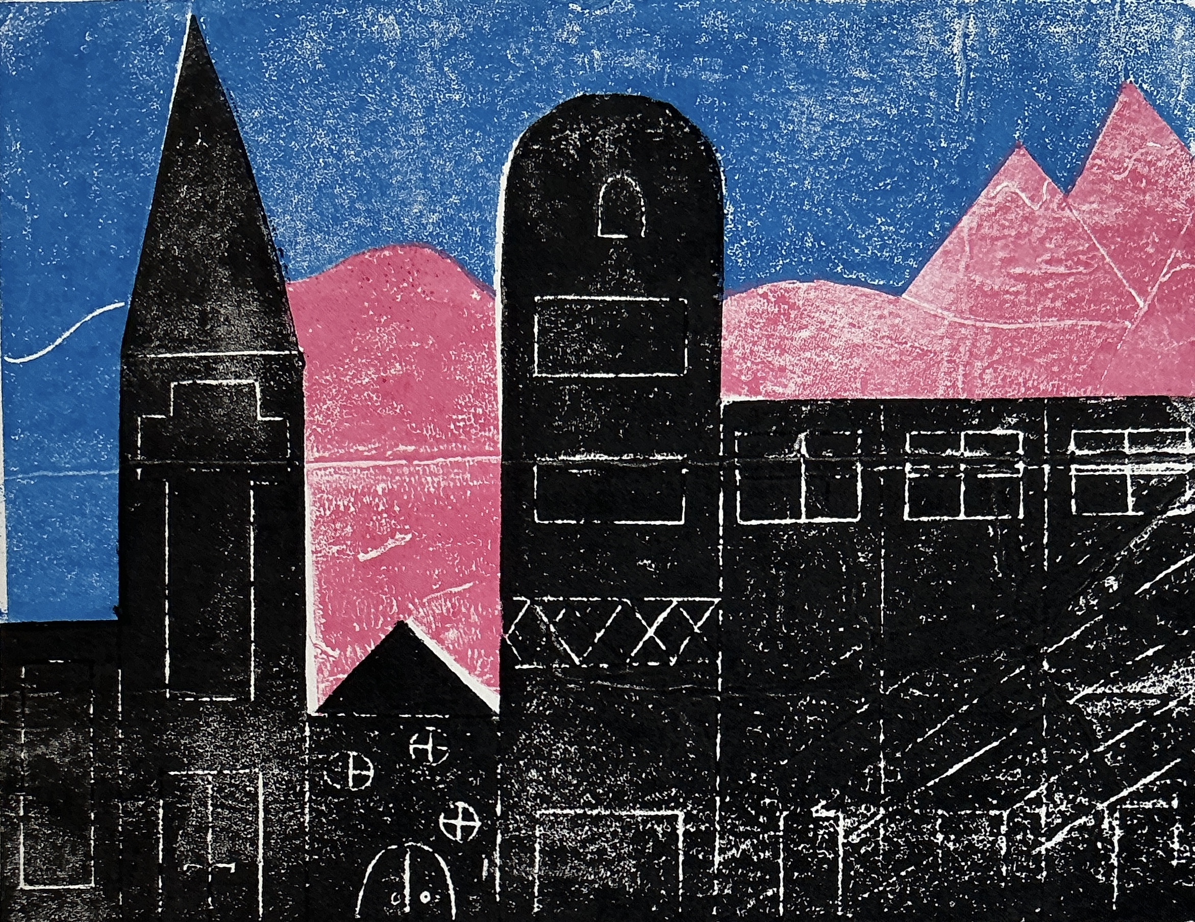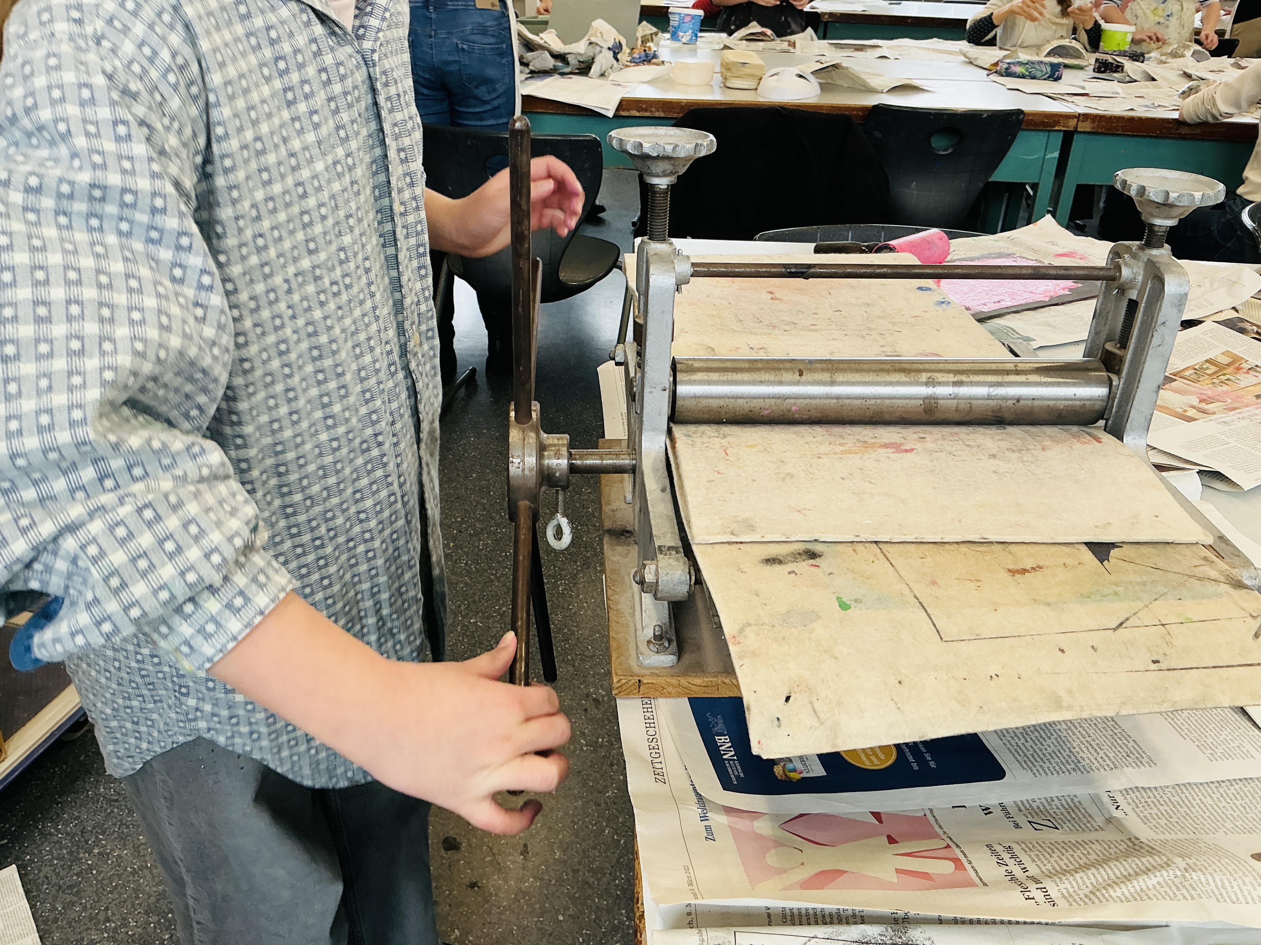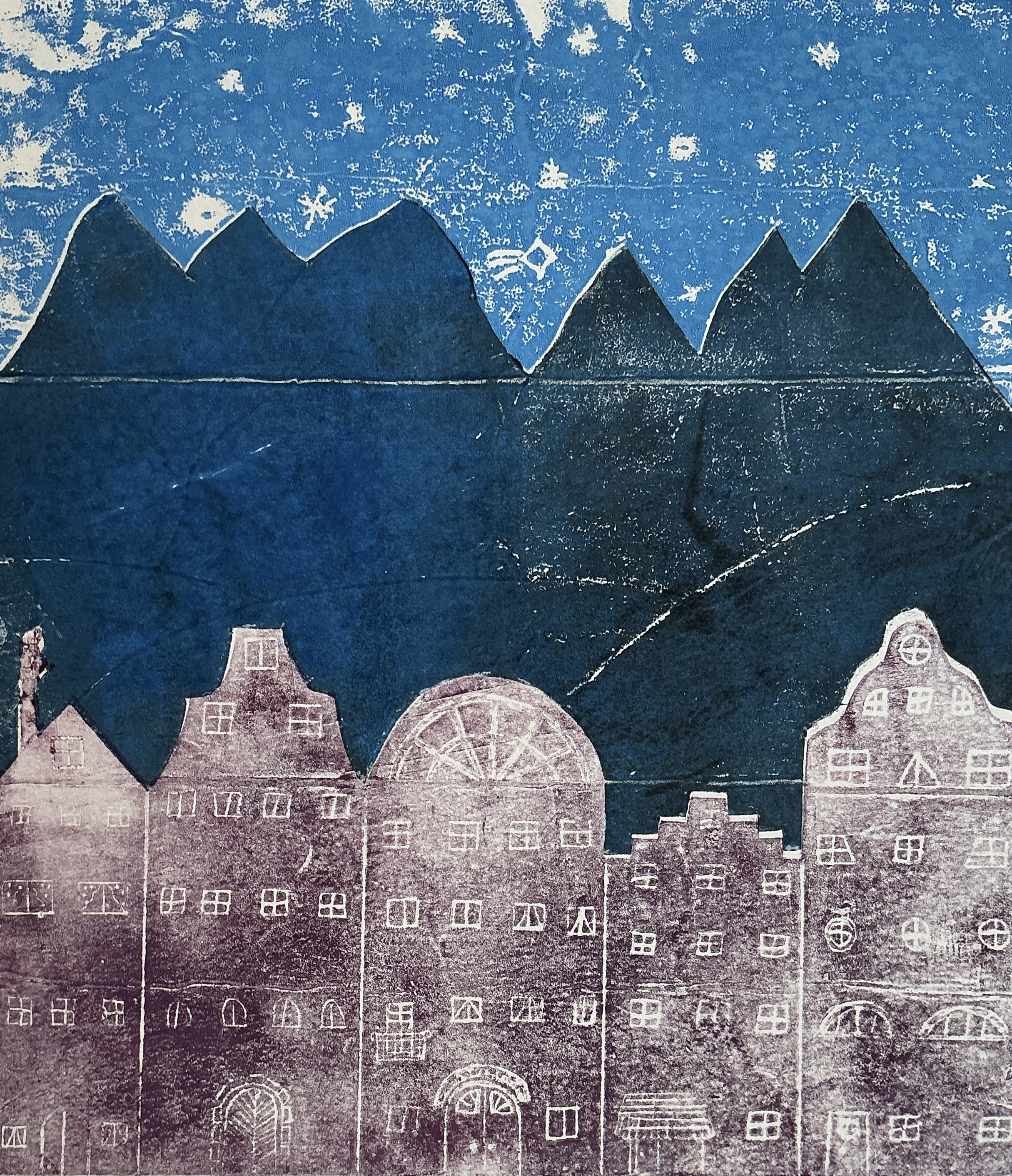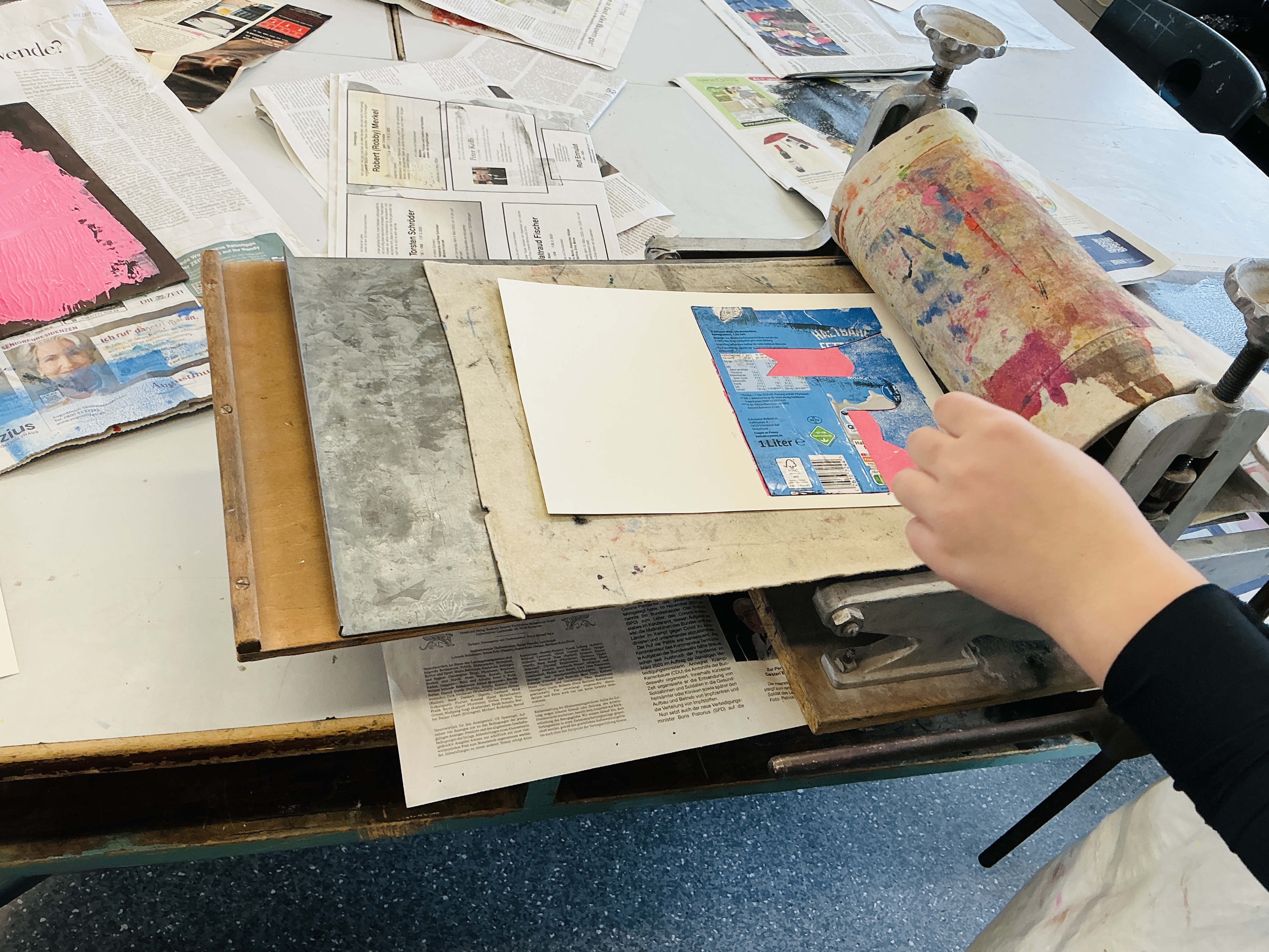 Die Klasse 6a druckte im Kunstunterricht Ansichten von Häuserfassaden als „Weißliniendruck“. Leere Milch- und Safttüten dienten hier als Druckplatten. Auf den glatten Innenseiten dieser Kartonverpackungen wurden zunächst die feinen Fassadenzeichnungen mit Kugelschreiber eingeritzt. Anschließend wurden die einzelnen „Druckstöcke“ mit Farbe eingewalzt und schließlich mit der Druckpresse auf Papier gedruckt.