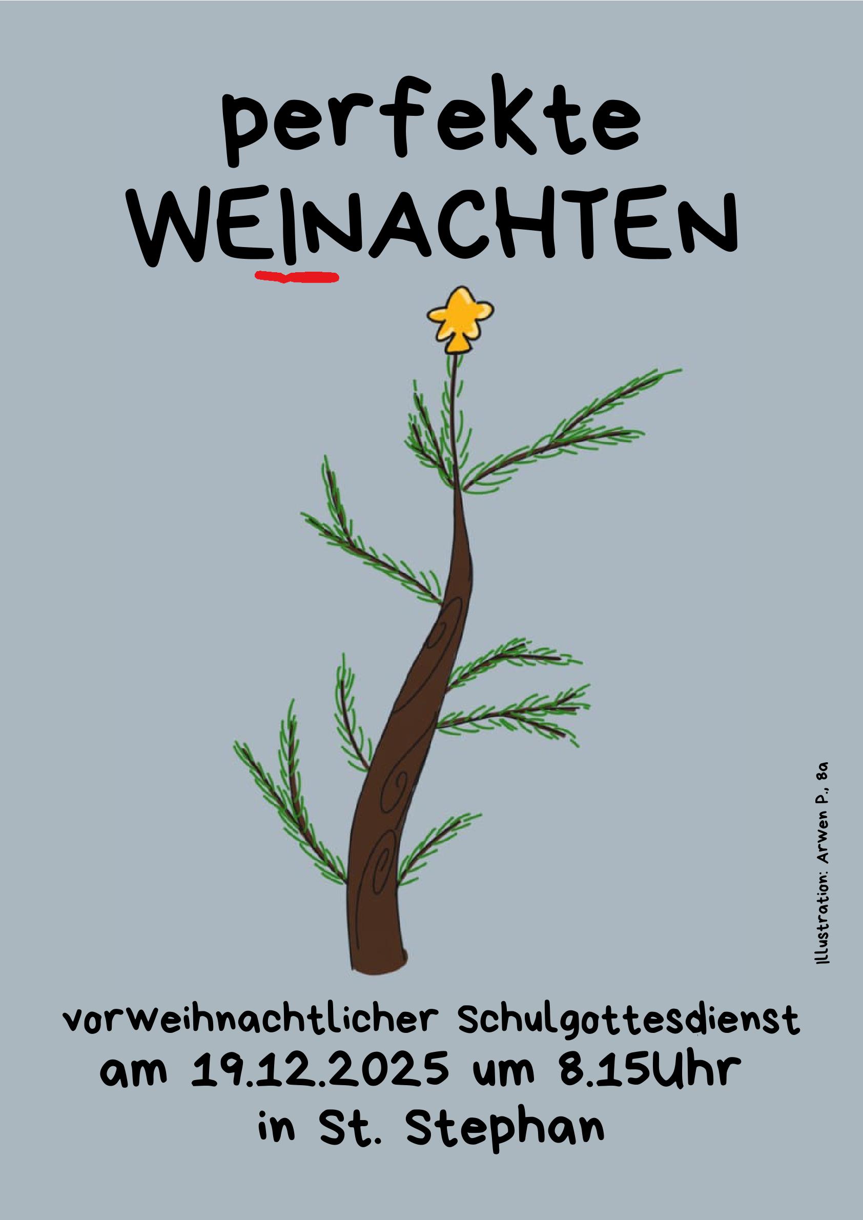 Wir laden euch und Sie alle ganz herzlich zu unserem vorweihnachtlichen Schulgottesdienst am 19.12. um 8.15 Uhr in St. Stephan ein. Alle Schülerinnen, Lehrkräfte, Eltern, Großeltern, Ehemalige, Gäste… sind ganz herzlich willkommen!