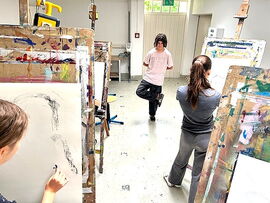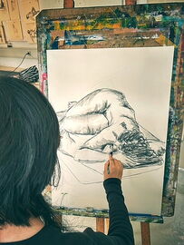 Das Highlight war definitiv das Aktmodell am nächsten Tag. Am Vortag hatten wir bereits geübt, schnell und grob die Grundformen des Körpers in verschiedenen Positionen im Raum zu erfassen. Um die zehn verschiedenen Posen des Aktmodells zu zeichnen, hatten wir kurze Zeichenphasen (5 min) und längere (30 min). Über drei Stunden haben wir ohne Unterbrechung konzentriert gezeichnet. Die Zeit verging wie im Flug und wir sind dankbar, diese einmalige Möglichkeit, einen Menschen mit allen anatomischen Details in seiner Ganzheit zu erfassen, gehabt zu haben.